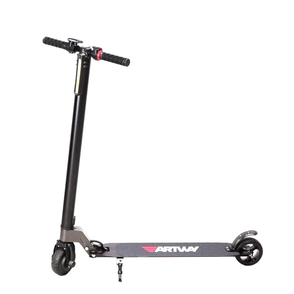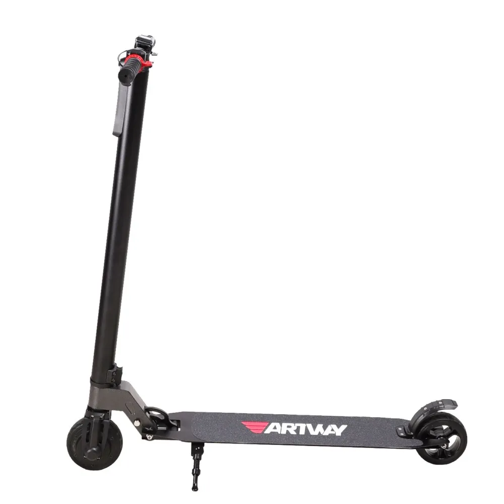 Электросамокат Artway AM-2444 – легкое в управление устройство, позволяющее с комфортом передвигаться по городу. Благодаря компактным размерам и небольшому весу (7,2 кг) им могут пользоваться даже дети. При этом прочная алюминиевая рама выдерживает нагрузки до 100 кг, а высота руля предполагает, что рост пользователя может достигать 190 см. Несмотря на небольшие размеры, самокат имеет хорошие технические показатели. Двигатель может обеспечить быстрое ускорение до 25 км / ч и выдерживает небольшие уклоны до 15 градусов. Электрический самокат может проехать 12 километров без подзарядки. Большая дека покрыта нескользящим покрытием, обеспечивающим удобное положение ног. Самокат оснащен металлической подножкой и его можно легко припарковать в любом месте. Электронные и механические тормоза обеспечивают качественное торможение.