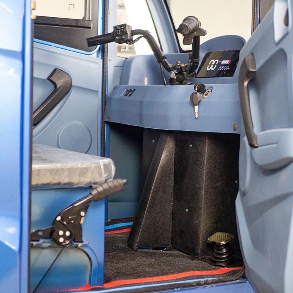 Усиленная конструкция рамы, барабанный тормоз и светодиодная передняя фара гарантируют безопасное вождение в любых условиях. Крытая герметичная кабина с открывающимися с двух сторон дверями обеспечивает защиту от непогоды, а механизм стеклоочистителя поддерживает чистоту лобового стекла.